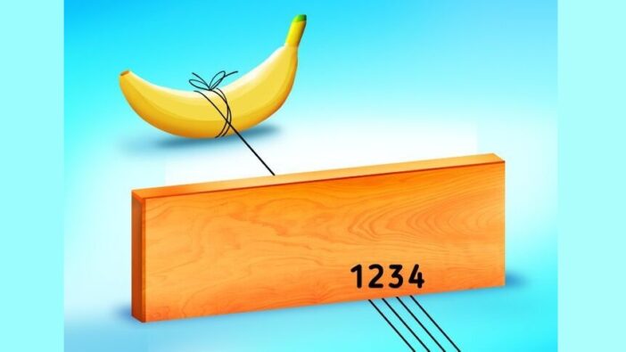 De raadsel presenteert een aantal touwen, een plank en een banaan. Welk touw is aan de banaan bevestigd? Nummer 1, 2, 3 of 4?
